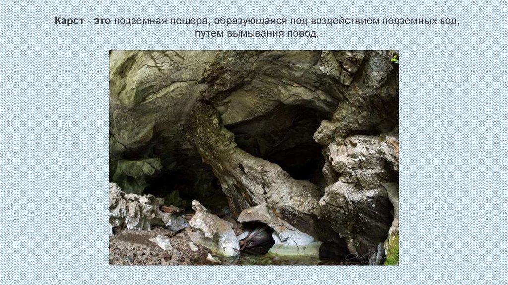 Карст - это подземная пещера, образующаяся под воздействием подземных вод,путем вымывания пород.
