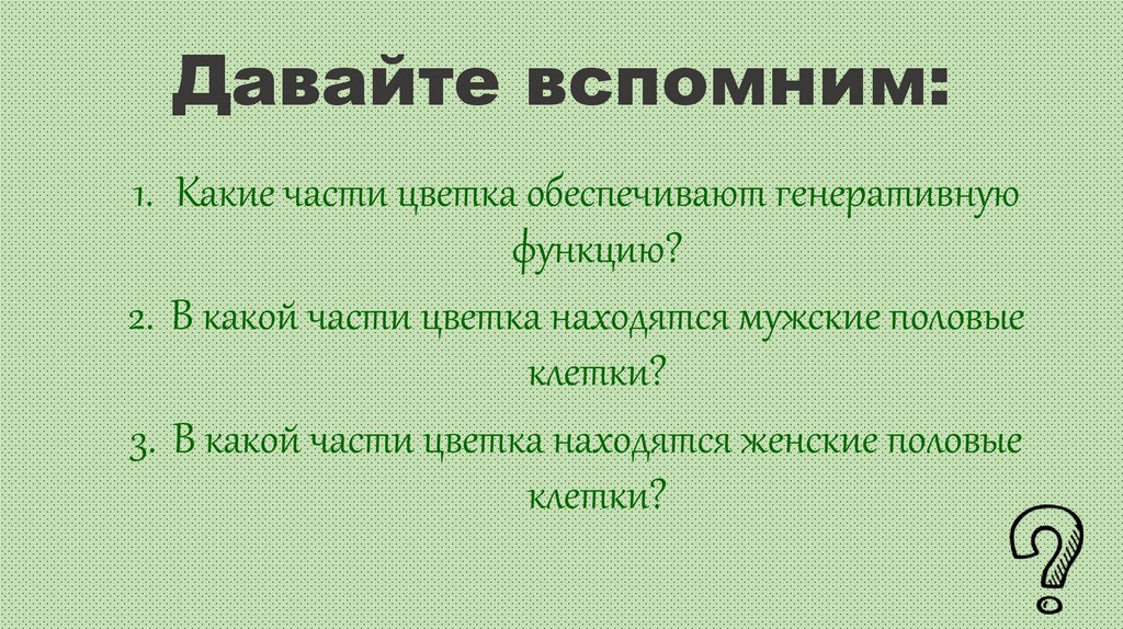 Давайте вспомним:1. Какие части цветка обеспечивают генеративную