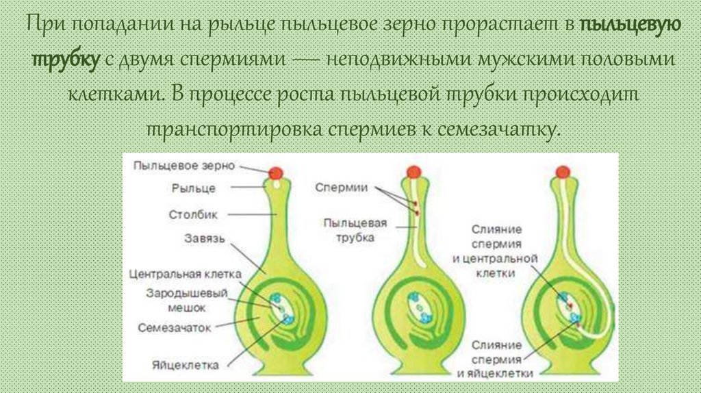При попадании на рыльце пыльцевое зерно прорастает в пыльцевуютрубку с двумя спермиями — неподвижными мужскими половыми
