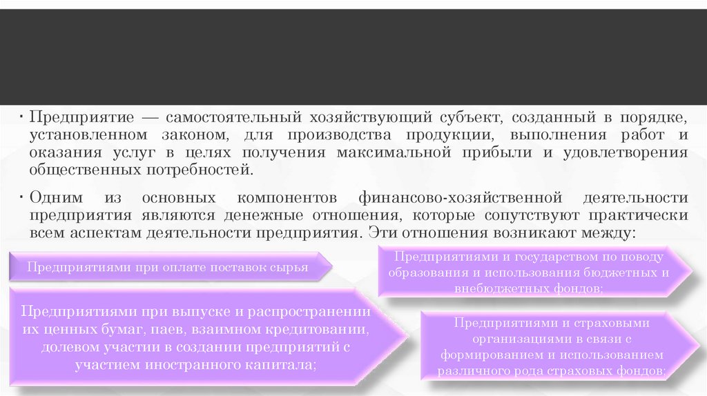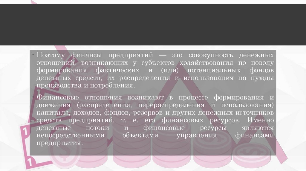 Поэтому финансы предприятий — это совокупность денежныхотношений, возникающих у субъектов хозяйствования по поводу