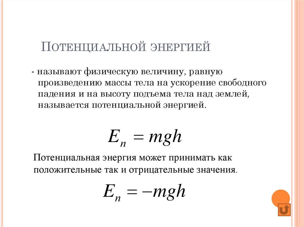 ПОТЕНЦИАЛЬНОЙ ЭНЕРГИЕЙ- называют физическую величину, равную