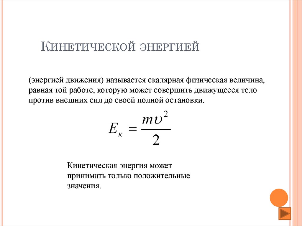 КИНЕТИЧЕСКОЙ ЭНЕРГИЕЙ(энергией движения) называется скалярная физическая величина,