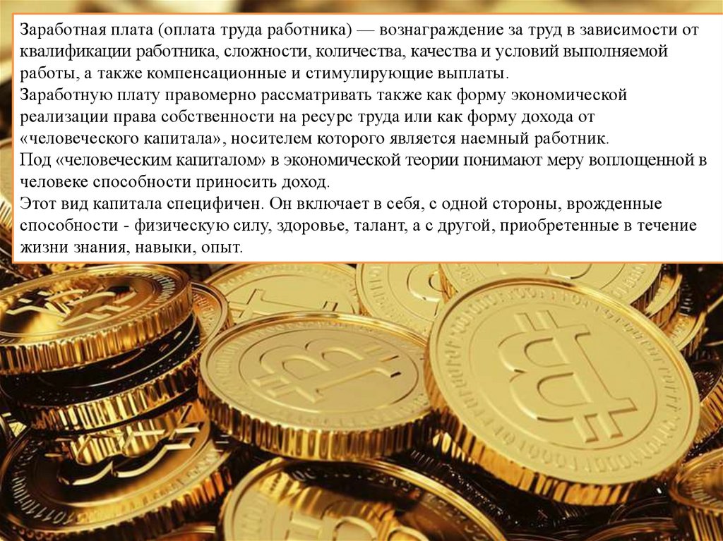 Заработная плата (оплата труда работника) — вознаграждение за труд в зависимости отквалификации работника, сложности, количества, качества и условий выполняемой