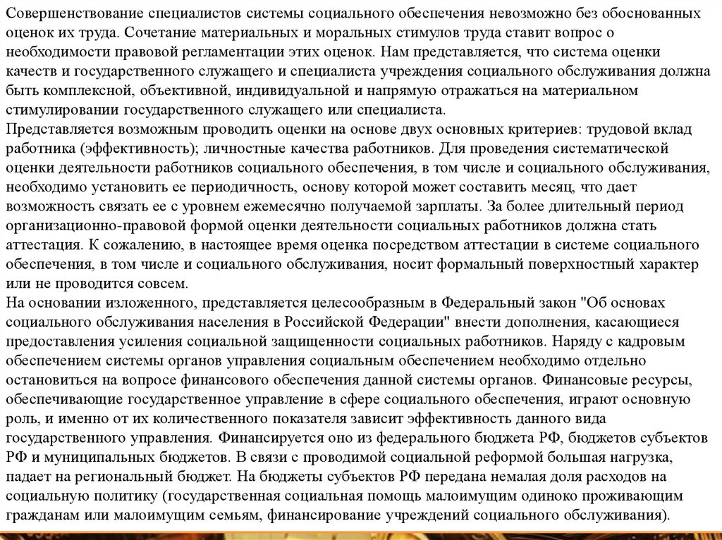 Совершенствование специалистов системы социального обеспечения невозможно без обоснованныхоценок их труда. Сочетание материальных и моральных стимулов труда ставит вопрос о