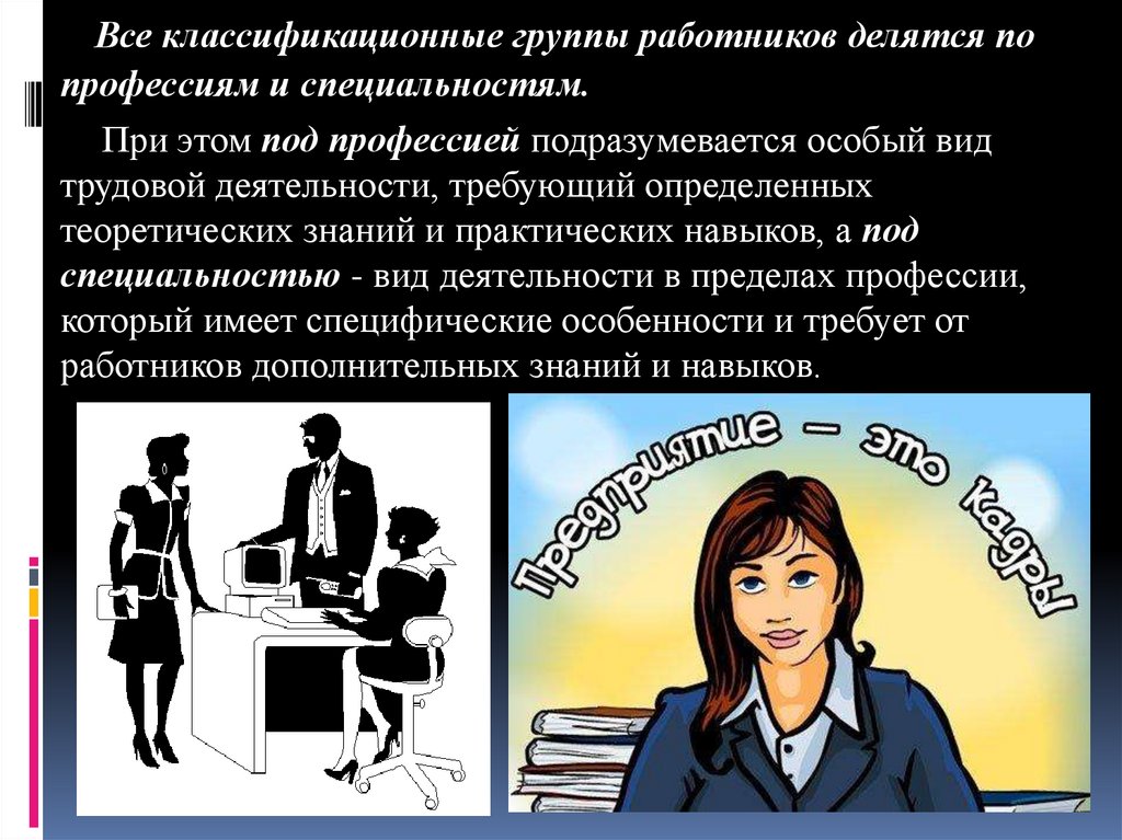 Все классификационные группы работников делятся попрофессиям и специальностям.