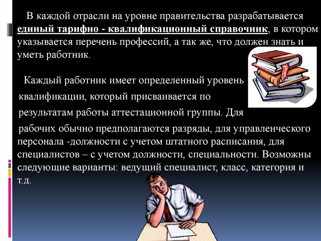 В каждой отрасли на уровне правительства разрабатываетсяединый тарифно - квалификационный справочник, в котором