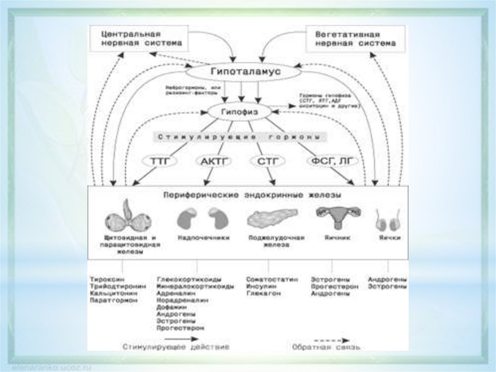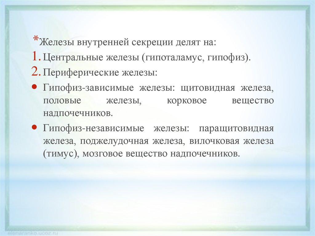 *Железы внутренней секреции делят на:1. Центральные железы (гипоталамус, гипофиз).