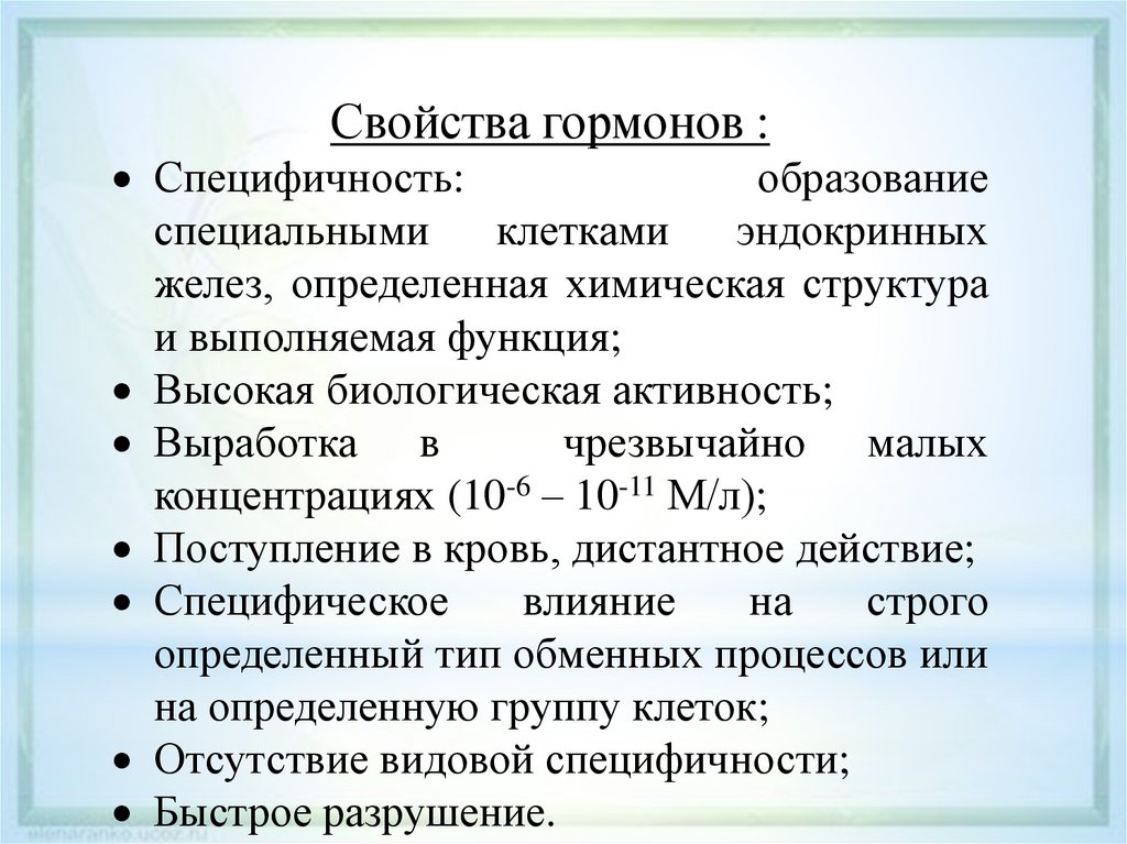 Свойства гормонов :Специфичность: