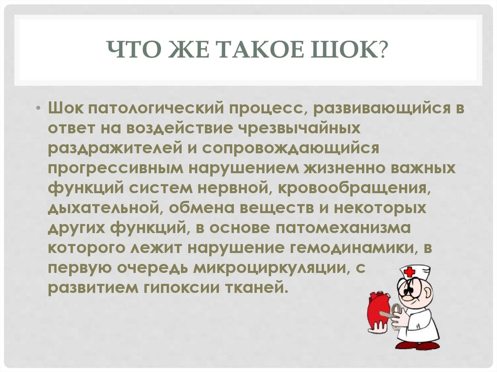 ЧТО ЖЕ ТАКОЕ ШОК?• Шок патологический процесс, развивающийся в