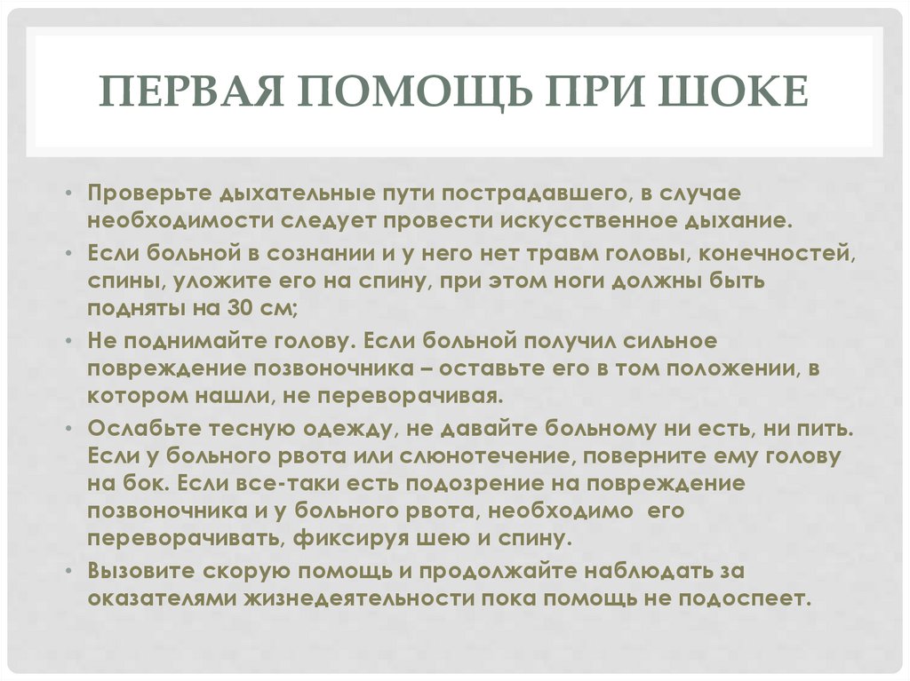 ПЕРВАЯ ПОМОЩЬ ПРИ ШОКЕ• Проверьте дыхательные пути пострадавшего, в случае