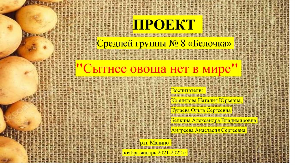 Цель проекта: Вовлечение детей в познавательную, игровую и опытно-экспериментальную деятельность повыращиванию и наблюдению овоща в комнатных условиях.