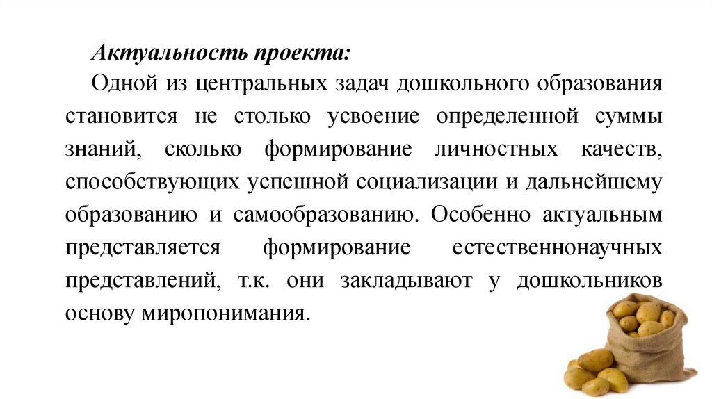 Актуальность проекта:Одной из центральных задач дошкольного образования