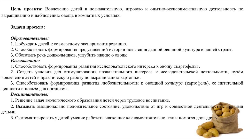 1. Способствовать формирования развития исследовательского интереса к овощу «картофель».