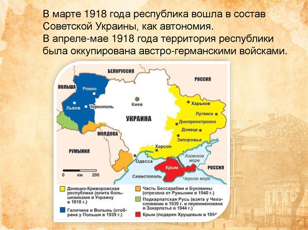 В марте 1918 года республика вошла в составСоветской Украины, как автономия.