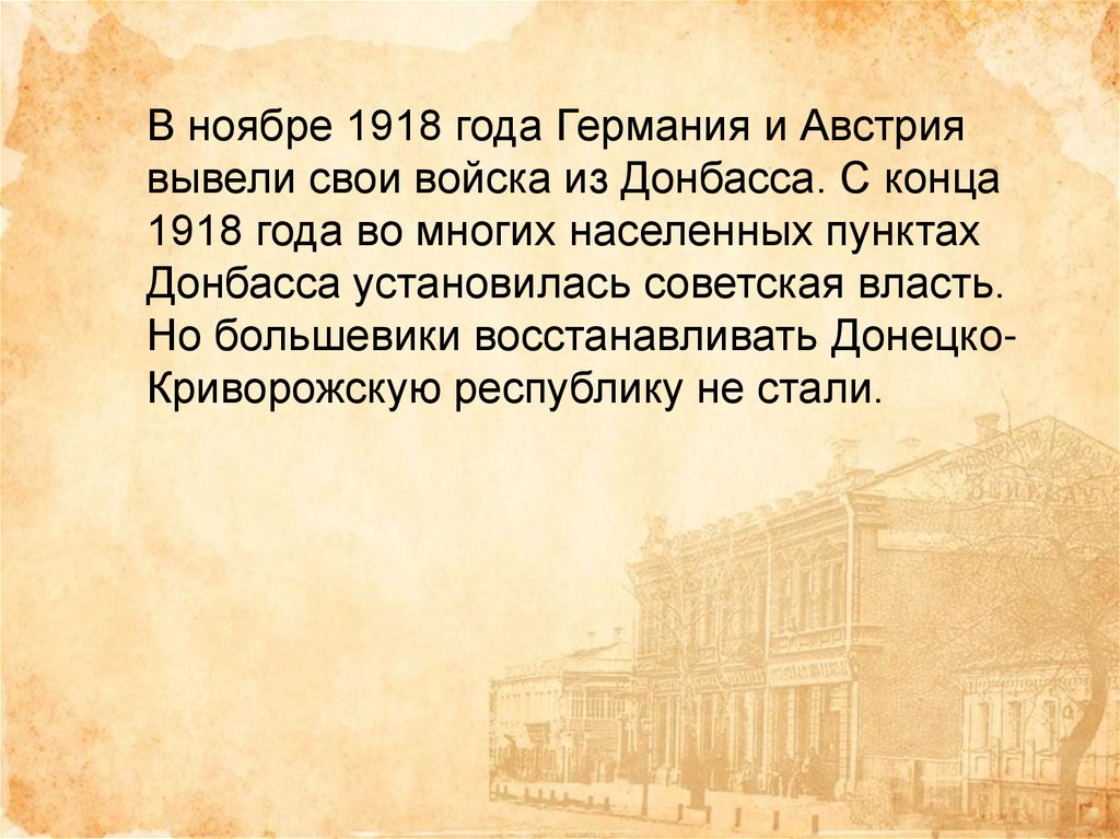 В ноябре 1918 года Германия и Австриявывели свои войска из Донбасса. С конца