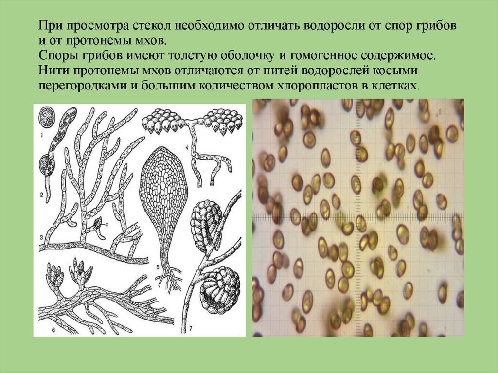 При просмотра стекол необходимо отличать водоросли от спор грибови от протонемы мхов.
