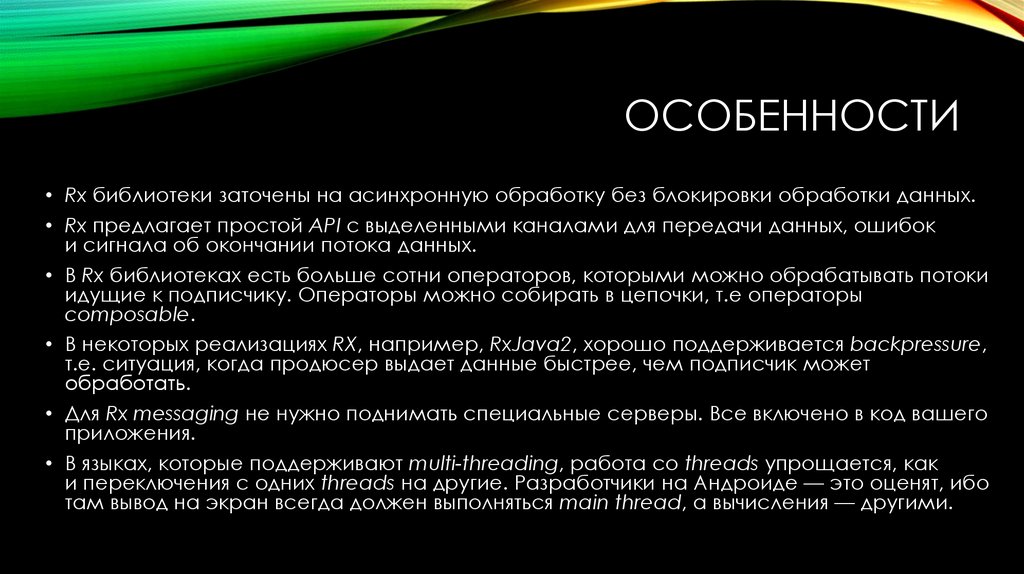 ОСОБЕННОСТИ• Rx библиотеки заточены на асинхронную обработку без блокировки обработки данных.