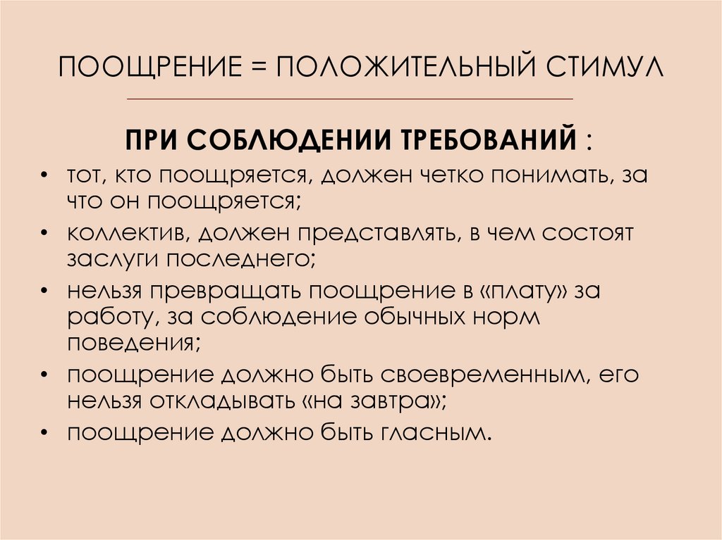 ПООЩРЕНИЕ = ПОЛОЖИТЕЛЬНЫЙ СТИМУЛПРИ СОБЛЮДЕНИИ ТРЕБОВАНИЙ :