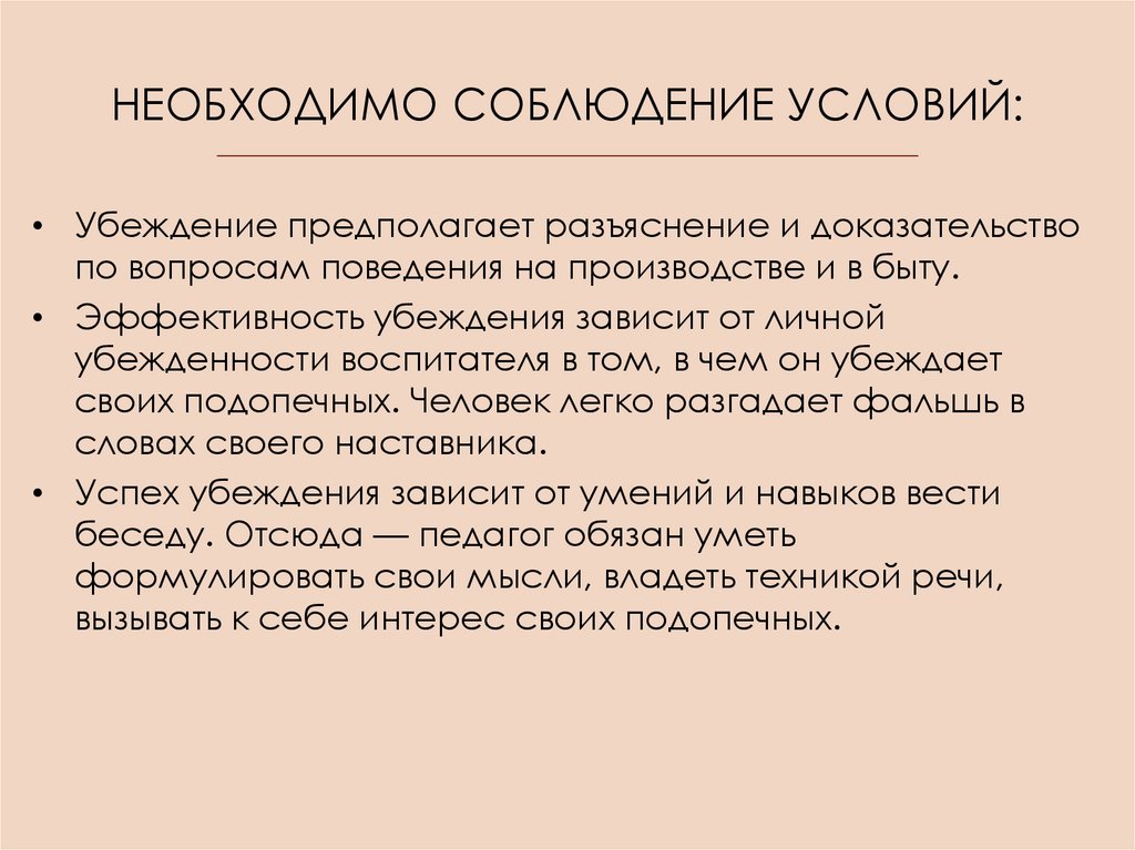 НЕОБХОДИМО СОБЛЮДЕНИЕ УСЛОВИЙ:• Убеждение предполагает разъяснение и доказательство