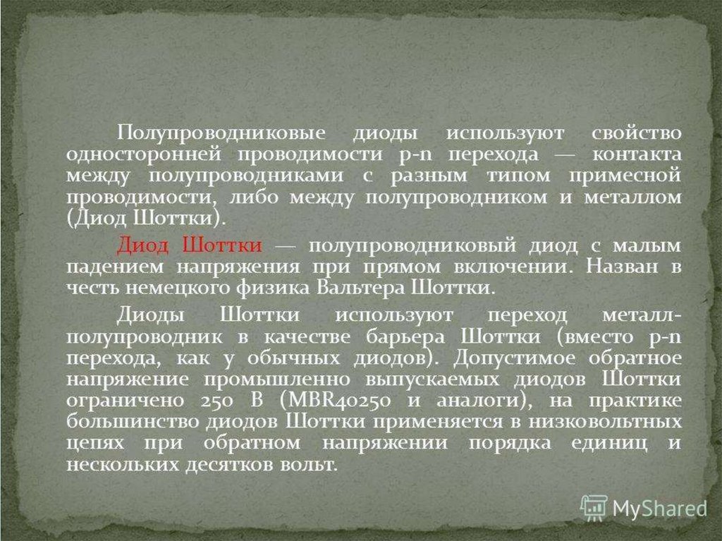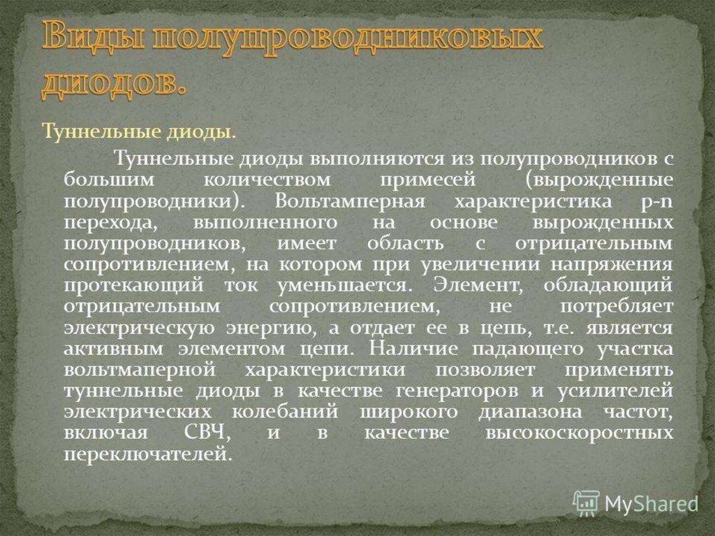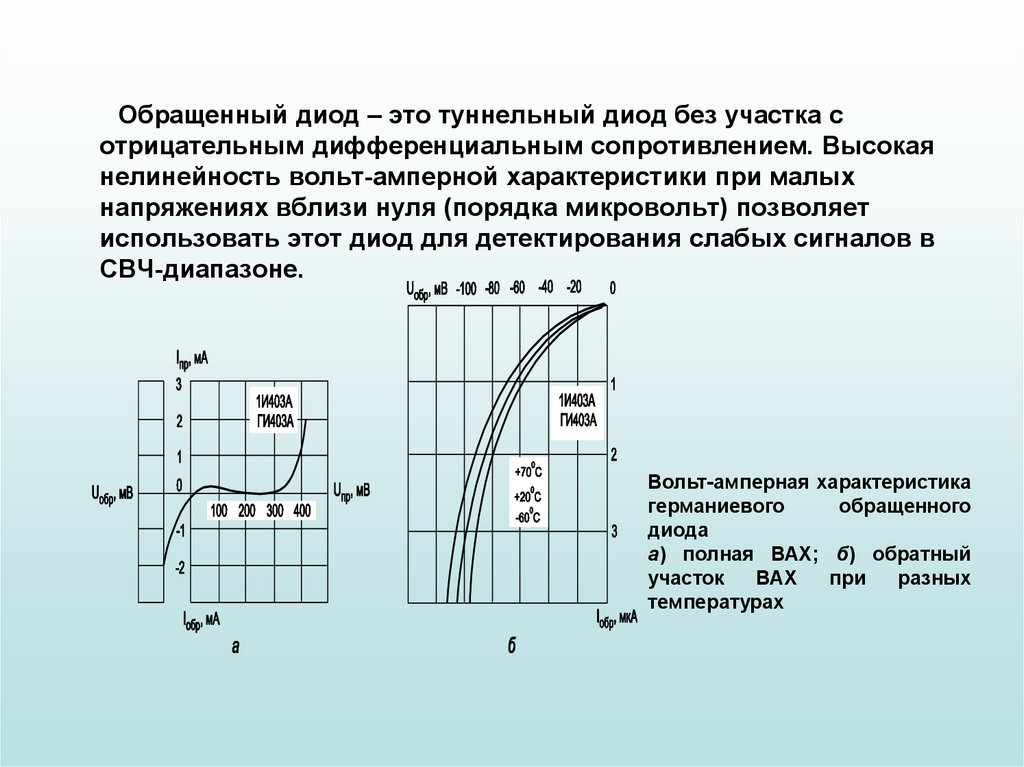 Обращенный диод – это туннельный диод без участка сотрицательным дифференциальным сопротивлением. Высокая