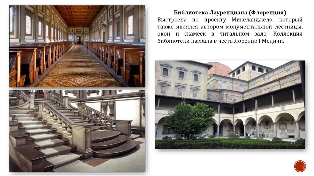 Библиотека Лауренциана (Флоренция)Выстроена по проекту Микеланджело, который