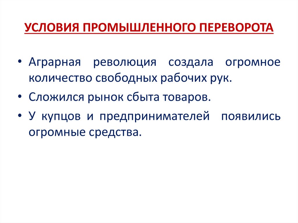 УСЛОВИЯ ПРОМЫШЛЕННОГО ПЕРЕВОРОТА• Аграрная революция создала огромное