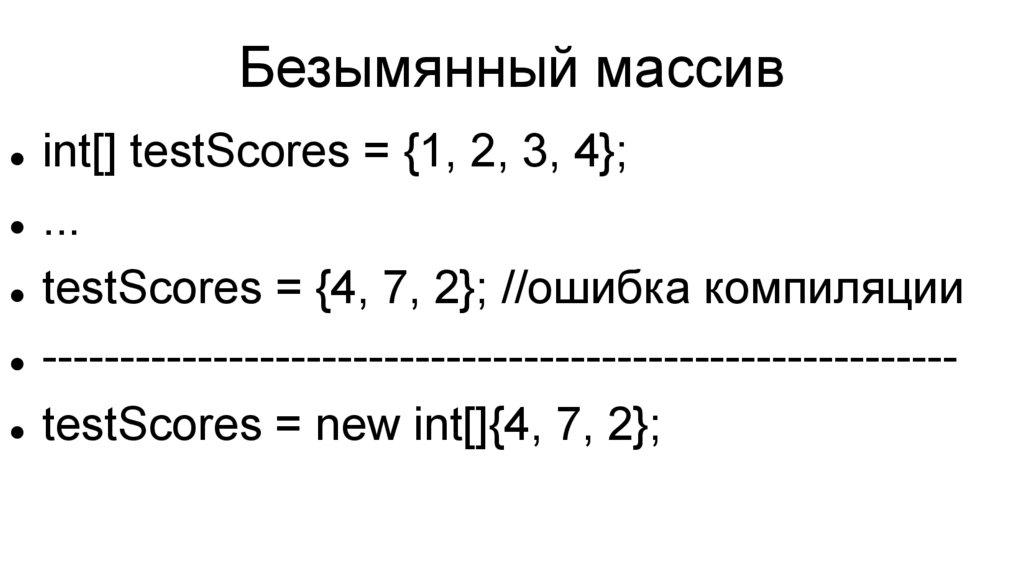 Безымянный массивint[] testScores = {1, 2, 3, 4};