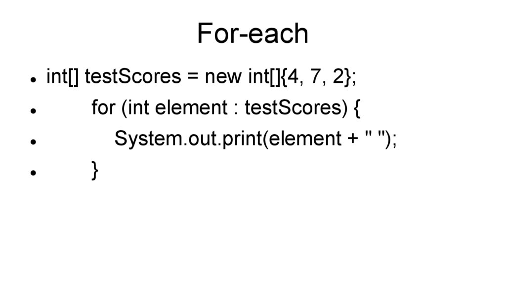 For-eachint[] testScores = new int[]{4, 7, 2};