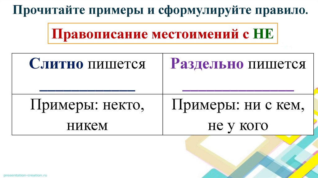 Прочитайте примеры и сформулируйте правило.Правописание местоимений с НЕ