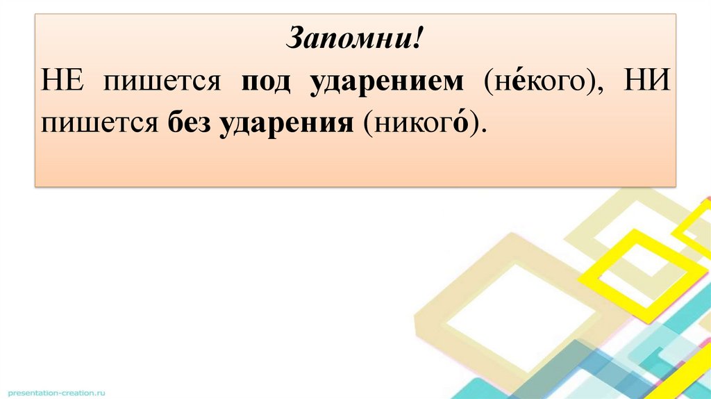 Запомни!НЕ пишется под ударением (не́кого), НИ