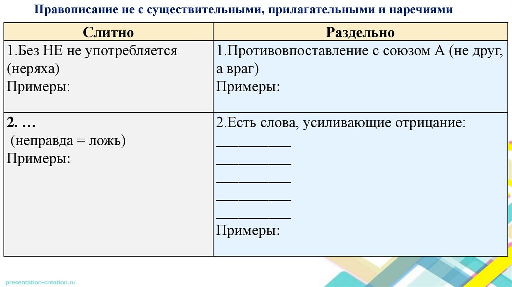Правописание не с существительными, прилагательными и наречиямиСлитно