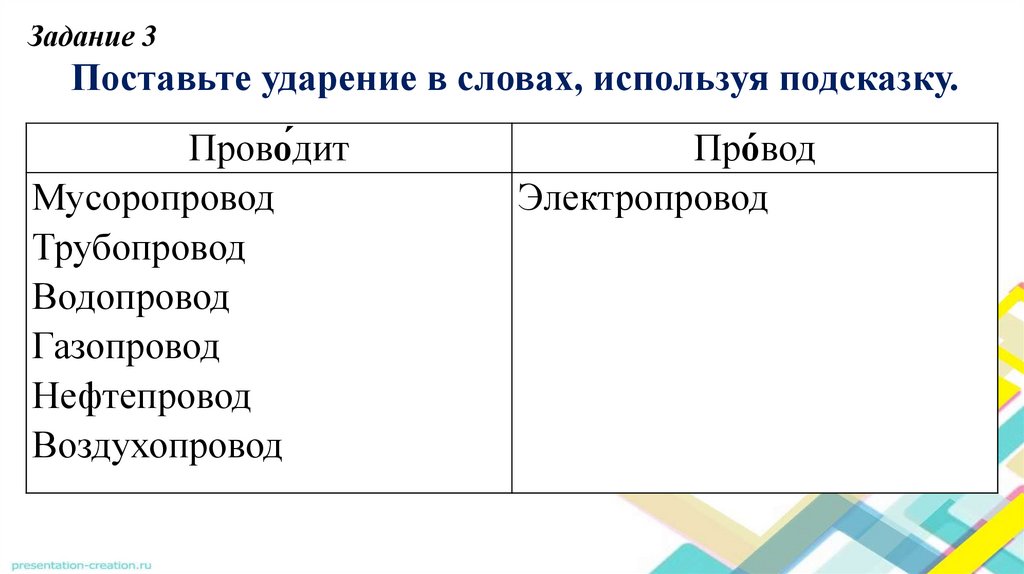 Задание 3Поставьте ударение в словах, используя подсказку.