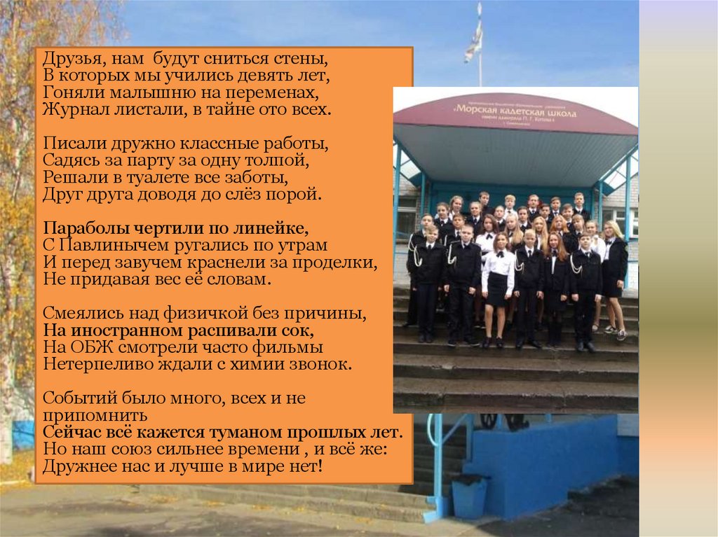 Друзья, нам будут сниться стены,В которых мы учились девять лет,