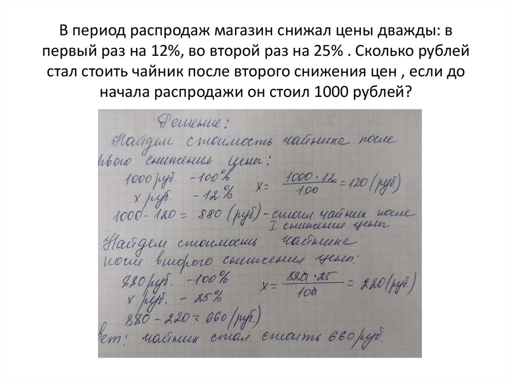 В период распродаж магазин снижал цены дважды: впервый раз на 12%, во второй раз на 25% . Сколько рублей