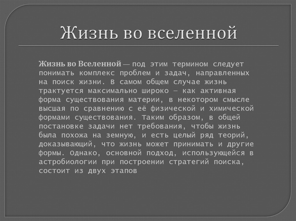 Жизнь во Вселенной — под этим термином следуетпонимать комплекс проблем и задач, направленных