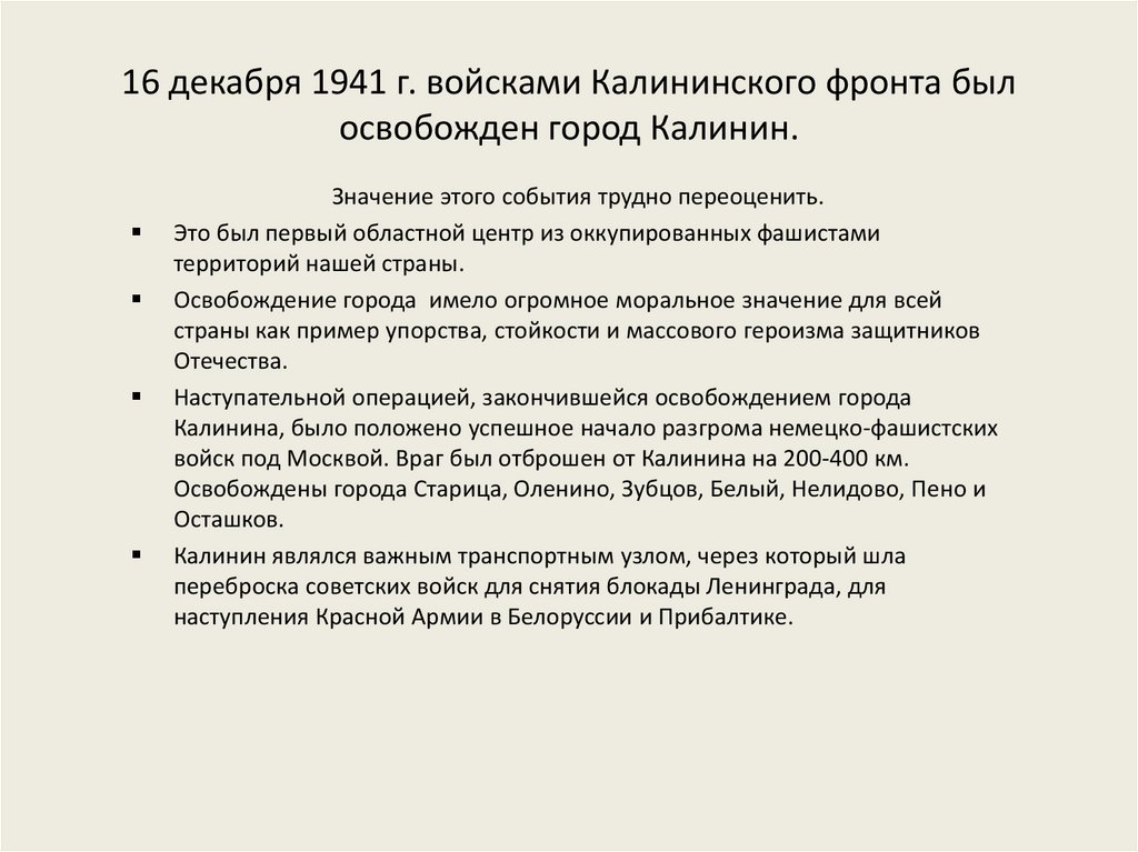 16 декабря 1941 г. войсками Калининского фронта былосвобожден город Калинин.