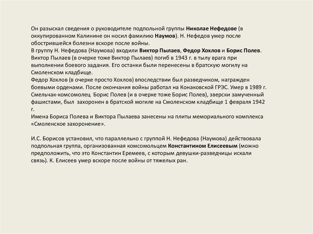 Он разыскал сведения о руководителе подпольной группы Николае Нефедове (воккупированном Калинине он носил фамилию Наумов). Н. Нефедов умер после