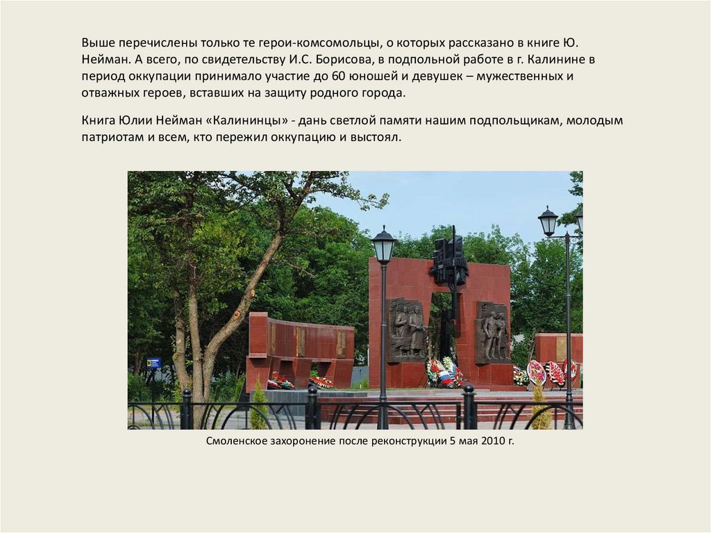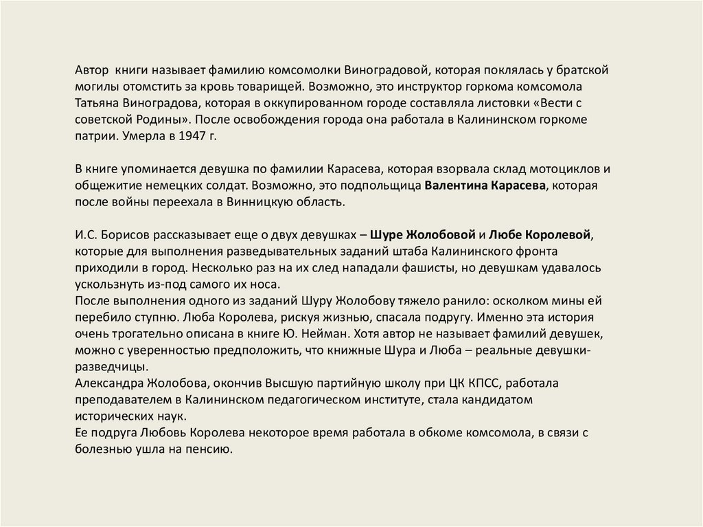 Выше перечислены только те герои-комсомольцы, о которых рассказано в книге Ю.Нейман. А всего, по свидетельству И.С. Борисова, в подпольной работе в г. Калинине в