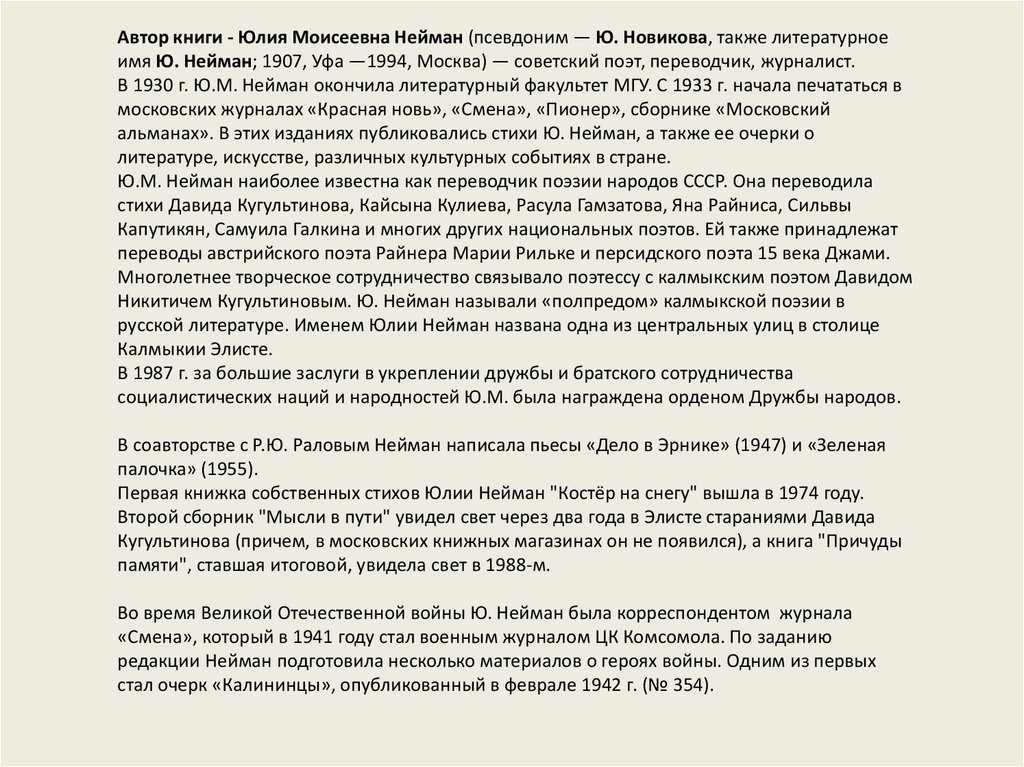 Автор книги - Юлия Моисеевна Нейман (псевдоним — Ю. Новикова, также литературноеимя Ю. Нейман; 1907, Уфа —1994, Москва) — советский поэт, переводчик, журналист.
