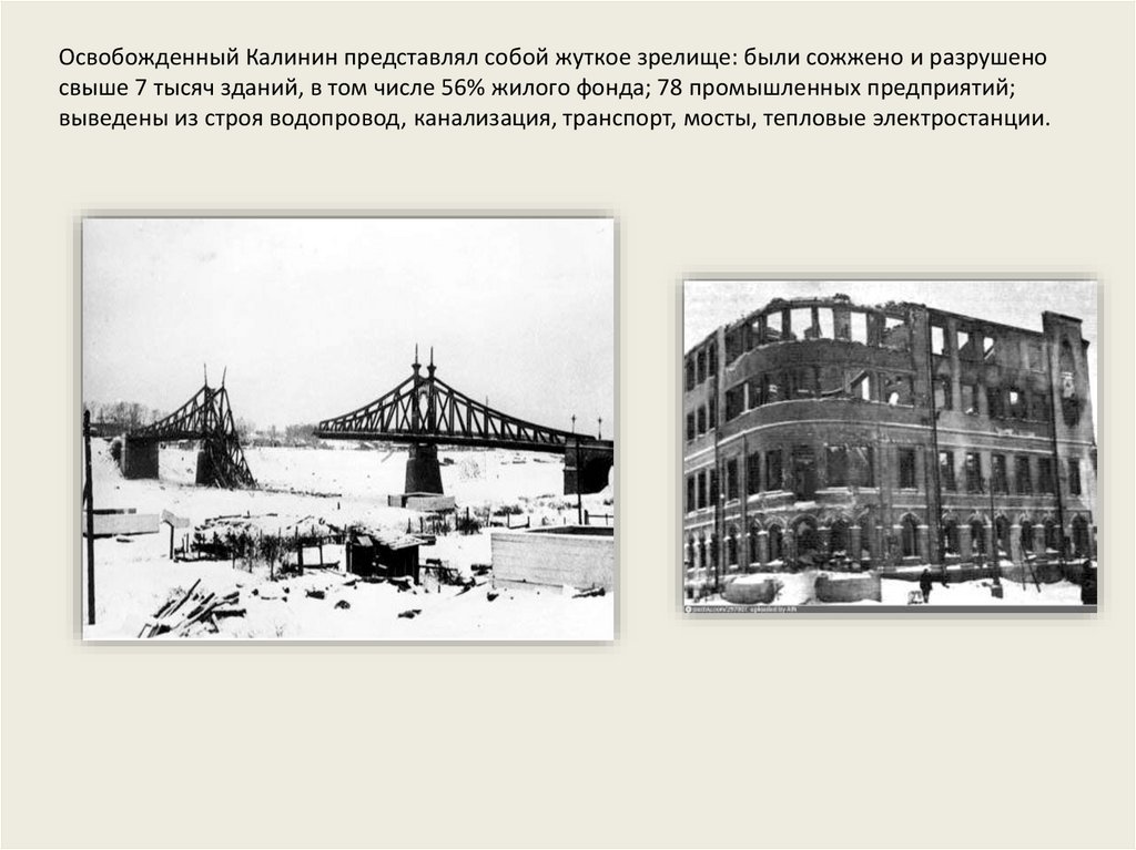 Освобожденный Калинин представлял собой жуткое зрелище: были сожжено и разрушеносвыше 7 тысяч зданий, в том числе 56% жилого фонда; 78 промышленных предприятий;