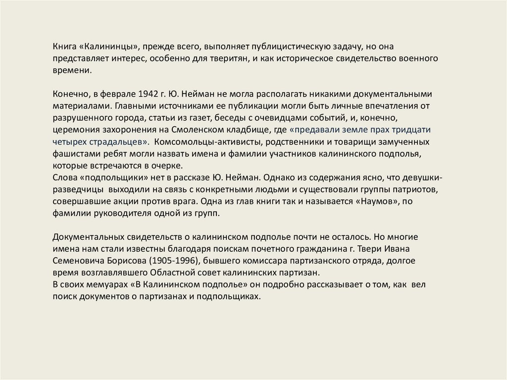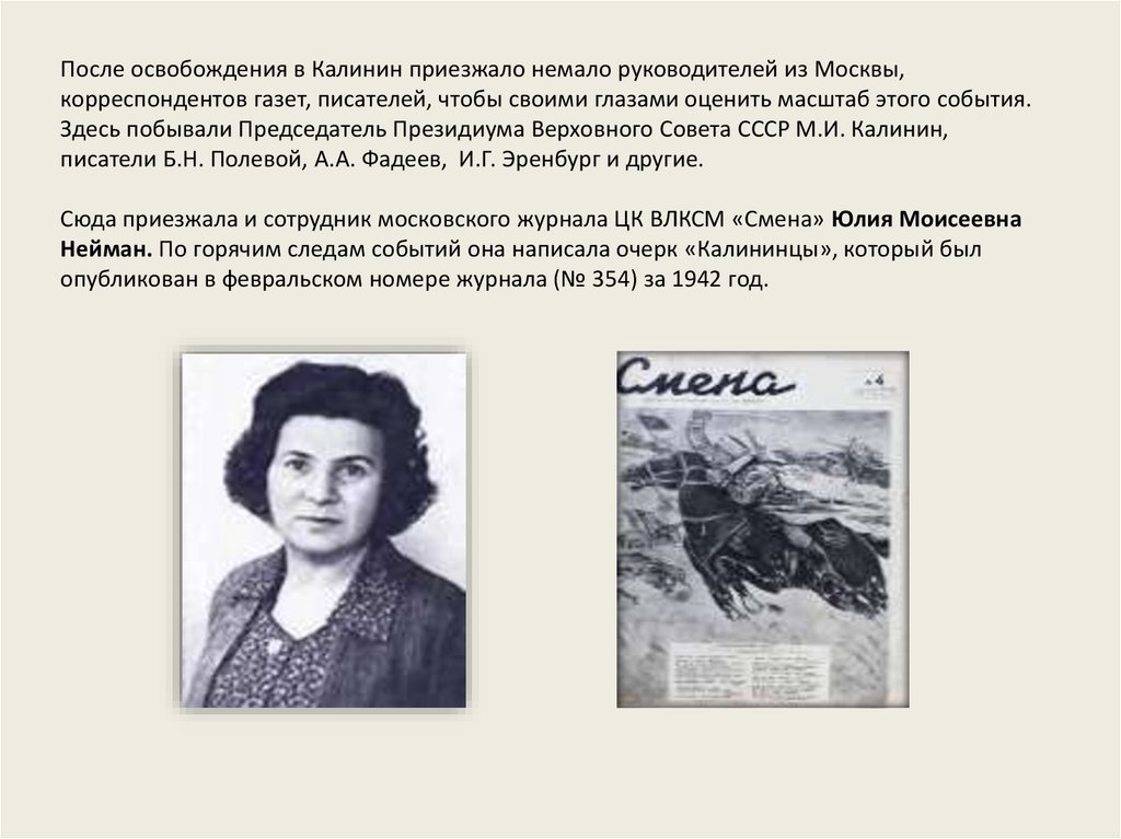 Нейман. По горячим следам событий она написала очерк «Калининцы», который был