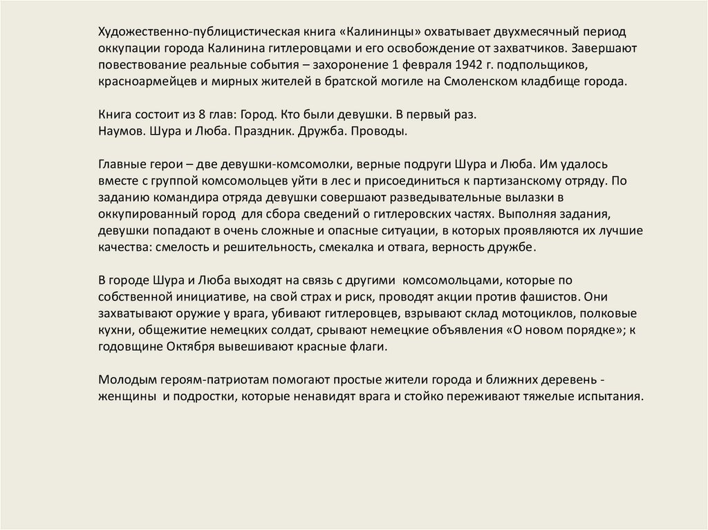 Художественно-публицистическая книга «Калининцы» охватывает двухмесячный периодоккупации города Калинина гитлеровцами и его освобождение от захватчиков. Завершают