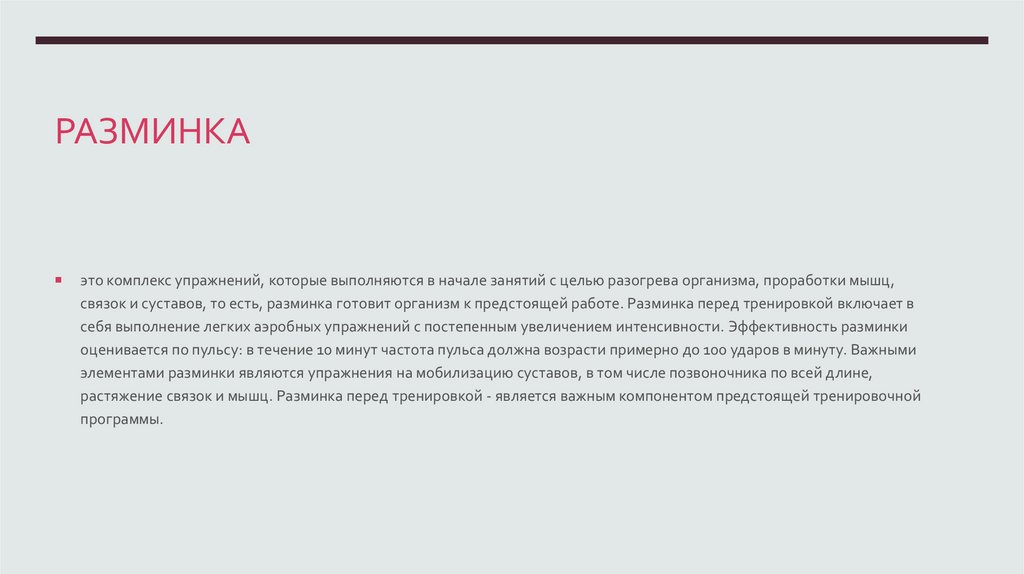 связок и суставов, то есть, разминка готовит организм к предстоящей работе. Разминка перед тренировкой включает в