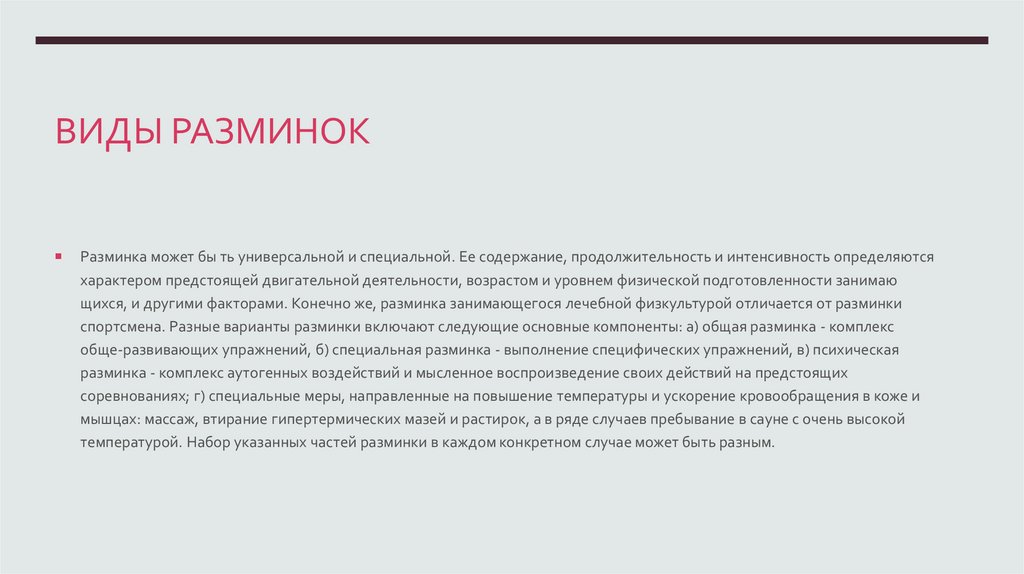ВИДЫ РАЗМИНОКРазминка может бы ть универсальной и специальной. Ее содержание, продолжительность и интенсивность определяются