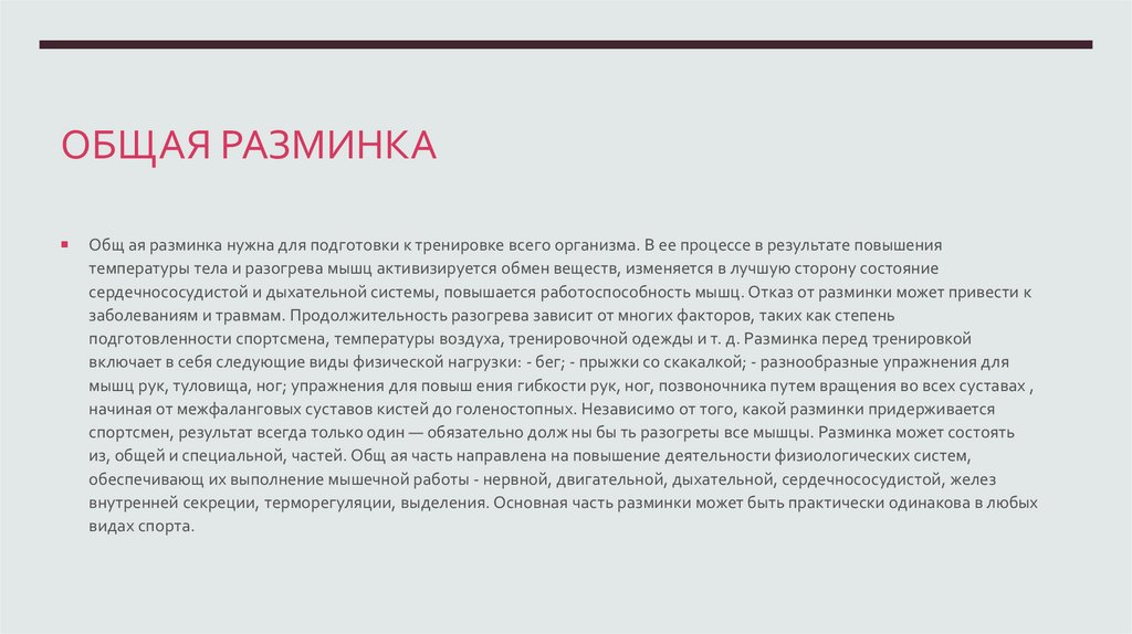 ОБЩАЯ РАЗМИНКАОбщ ая разминка нужна для подготовки к тренировке всего организма. В ее процессе в результате повышения