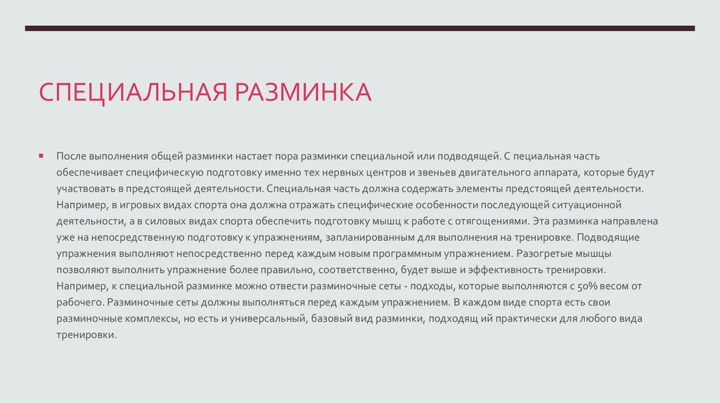 СПЕЦИАЛЬНАЯ РАЗМИНКАПосле выполнения общей разминки настает пора разминки специальной или подводящей. С пециальная часть