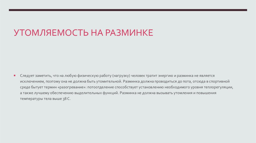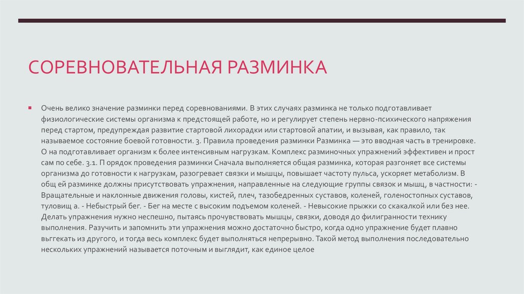 а также лучшему обеспечению выделительных функций. Разминка не должна вызывать утомления и повышения