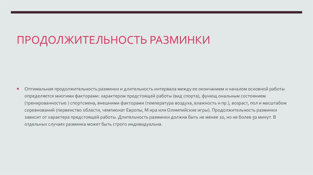 ПРОДОЛЖИТЕЛЬНОСТЬ РАЗМИНКИОптимальная продолжительность разминки и длительность интервала между ее окончанием и началом основной работы
