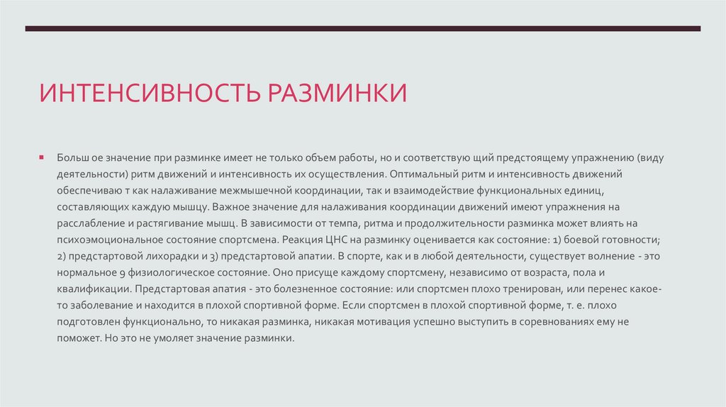 ИНТЕНСИВНОСТЬ РАЗМИНКИБольш ое значение при разминке имеет не только объем работы, но и соответствую щий предстоящему упражнению (виду