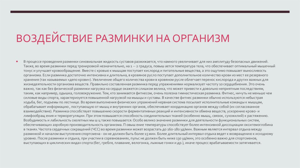 ВОЗДЕЙСТВИЕ РАЗМИНКИ НА ОРГАНИЗМВ процессе проведения разминки синовиальная жидкость суставов разжижается, что намного увеличивает для них амплитуду безопасных движений.